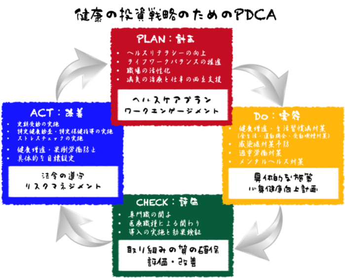健康への投資が企業の未来を変えることができる 健康経営とは、従業員の健康管理を経営課題とし、戦略的に取り組む経営手法のことです。 これはアメリカの臨床心理学者であるロバート・H・ローゼン(Robert H. Rosen)博士の著書の『The Health Company』に基づいた経営方針です。 これまで別々ものとされていた「経営管理」と「健康管理」を統合的に捉え、個人の健康増進を行うことで、企業の業績向上へとつなげるという考え方です。 企業は従業員の健康を増進することで、医療費を削減できるだけでなく、生産性の低下の防止や企業の収益性向上など、さまざまな効果が期待できます。企業の利益追求と働く人の心身の健康維持を両立することが、従業員個人の生活の質の向上のみならず、企業活力を高めることにつながることになります。 健康投資を考えるにあたってのポイント 1. 従業員の健康に対するライフスタイルへの影響 2. 従業員の健康に対する労働環境への影響 3. 組織の収益性に対する従業員の健康度への影響 4. 従業員の健康と組織の利益に対する家族、同僚、余暇などへの影響 従業員の健康を重要な経営資源として捉え、健康づくりの推進を「コスト」ではなく「将来への投資」と捉える前向きな考え方に企業の関心が高まっています。 参考文献:『ヘルシー・カンパニー―人的資源の活用とストレス管理』(ロバート・H. ローゼン (著)、 宗像 恒次 (翻訳)、産能大学出版部、1994年)ロバート・H・ローゼン(Robert H. Rosen) 健康経営と福利厚生の考え方 健康に投資することでのリターン 健康経営は、不健康な経営によって起こる会社と従業員の健康負債となる 負のスパイラル を断ち切り、健全な健康経営となる 正のスパイラル へと転換させることが最大の目的になります。 人は、不健康になるとモチベーションや集中力が大幅に低下し、ケアレスミスを頻発し、重大なインシデント事故に遭遇することになります。また、体調不良による遅刻や早退、欠勤が増え、従業員一人当たりの負担が増加し、疲弊した退職、さらに従業員の負担が増加、そして医療費負担や採用・育成コストが増加することになり、経営コスト圧迫を起こしてしまいます。このような状態が慢性化することによって、業績は大幅に悪化、企業イメージは低下、企業収益が減少し、健康投資を行う余裕がないまま負のスパイラルが続いていますことになります。 健康維持促進プログラムやワークライフバランス支援など戦略的に行うことは、1ドルの健康投資に対して約3ドルの投資リターンを得ることができると言われています。 健康経営は、従業員には心身ともに健康な状態で働くことのできる環境を作り、企業には健康投資によって大きなリターンを得られることができます。企業と従業員の相互に利益が得られる関係が、健康経営における目標になるということになります。 トータル・ヘルスプロモーション・プラン 従業員のための「心と体の健康プラン」は、個人の食事(栄養)・睡眠・運動などの生活習慣を見直すところから考え、継続が可能な計画を立てて、健康づくりをすすめることを上げています。従業員の心と体の健康増進を目標にしています。 ストレスに対する援助 リラクセーション方法の提案 良好な職場の雰囲気づくり 食生活、食行動の評価と改善提案 生活状況調査(仕事の内容、運動歴、睡眠、運動量、嗜好品など) 運動機能評価(粗大筋力、 柔軟性、バランス、運動量) これらの調査・評価より、運動プログラムの作成、運動提案の実施 健康経営優良法人認定制度について 健康経営にか変わる各種顕彰制度であり、優良な健康経営に取り組む法人を「見える化」し、従業員や求職者、関係企業や金融機関などから「従業員の健康管理を経営的な視点で考え、戦略的に取り組んでいる企業」として社会的に評価をされる制度で、2015年度から開始されたものです。 健康経営銘柄経済産業省は、東京証券取引所と共同で、「従業員の健康管理を経営的な視点で考え、戦略的に取り組んでいる企業のことを“健康経営銘柄”として選出、公表しています。その判断基準は主に以下の通りです。 ・健康経営が経営理念・方針に位置づけられているか・健康経営に取り組むための組織体制が構築されているか・健康経営に取り組むための制度があり、施策が実行されているか・健康経営の取り組みを評価し、改善に取り組んでいるか・法令を遵守しているか これらを満たして企業が健康経営銘柄として認定、公表されることで、投資家や従業員といったステークホルダーから適切に評価されやすくすることを目的としています。 健康経営優良法人の認定基準は ・経営理念 ・組織体制 ・制度/施策実行 ・評価/改善 ・法令遵守/リスクマネジメント の5つの大項目があり、実施が必須であるものと、何項目か以上実施していることが条件になっている項目があります。 また、大規模部門、中小規模部門でそれぞれ基準が異なります。 健康経